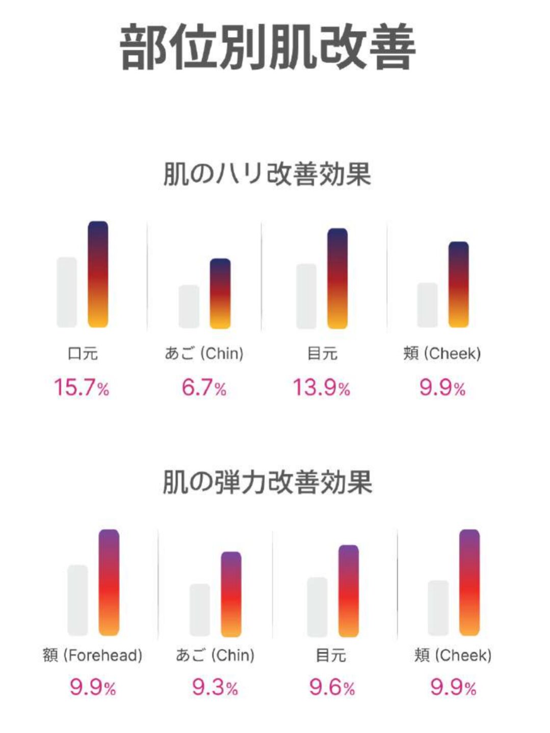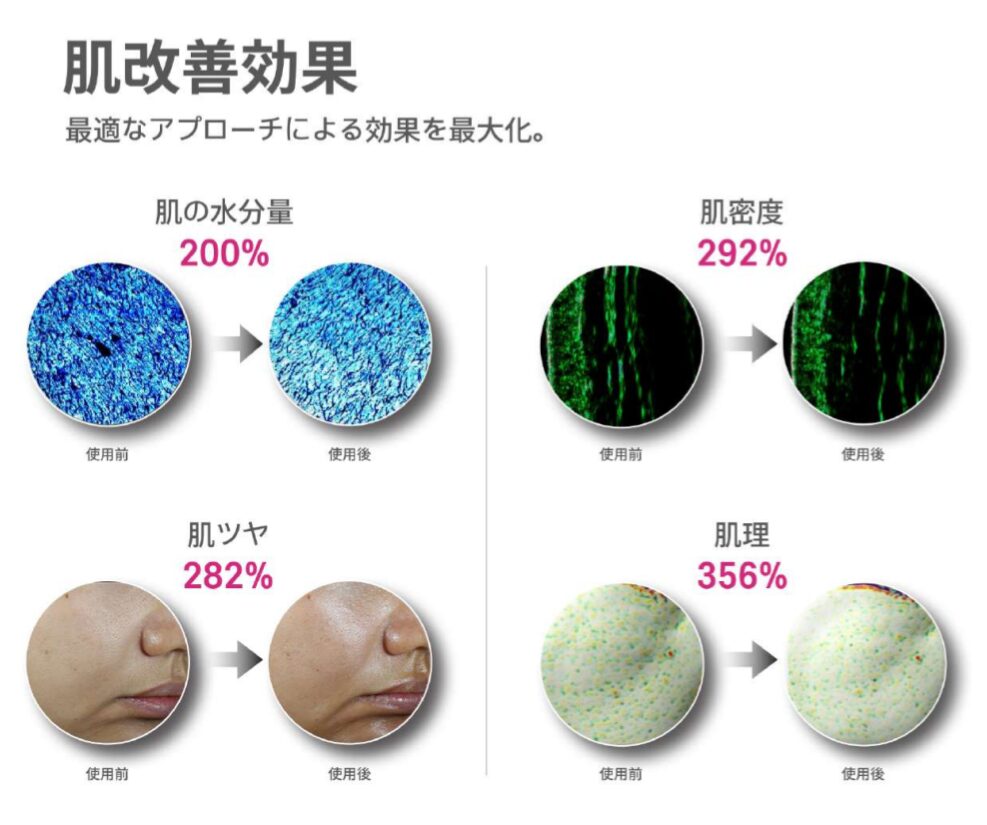 高周波超音波は老化メカニズム (MMPs HSPS. GAGs) をバランスよく激し、肌の老化予防や御力と保湿、全般的な肌の状態を改善します。